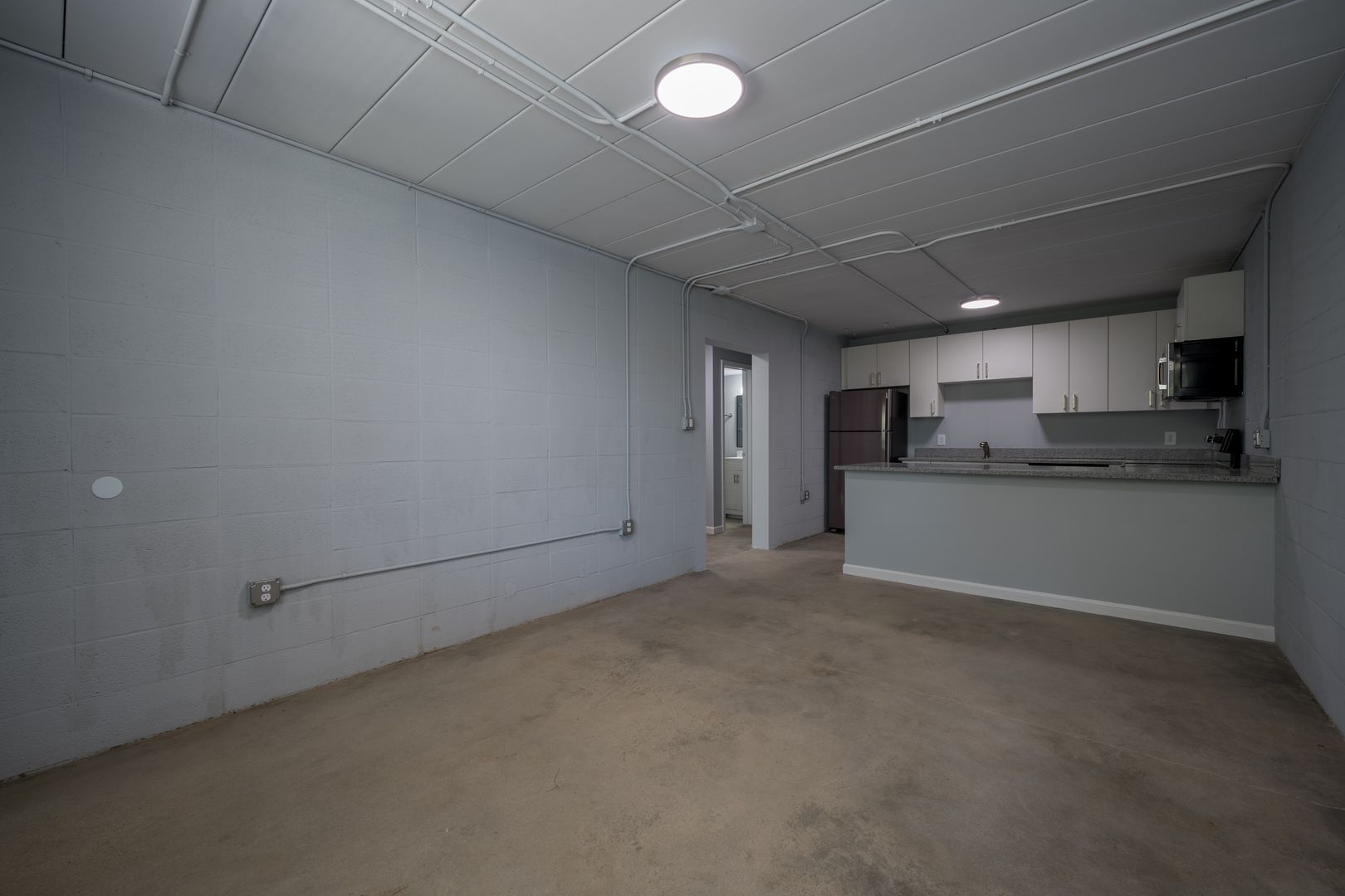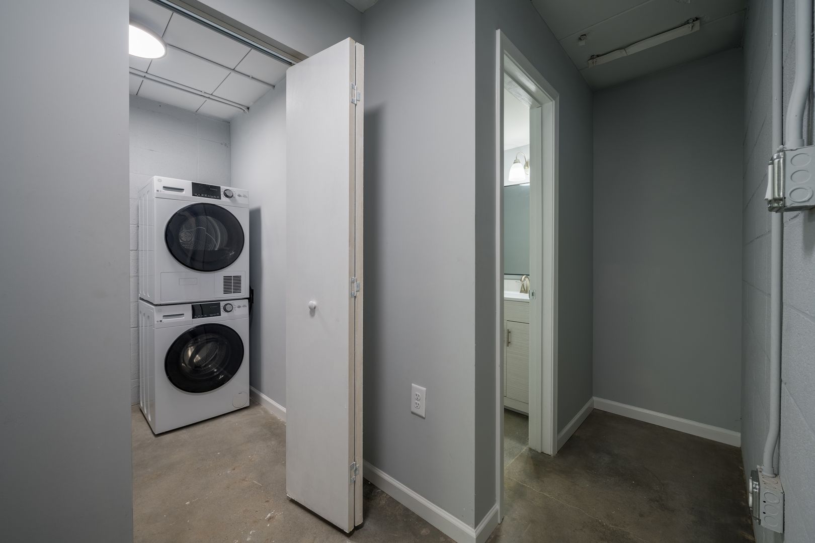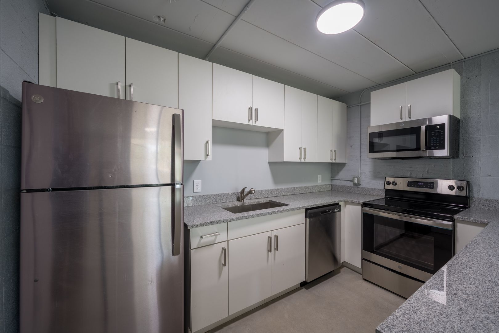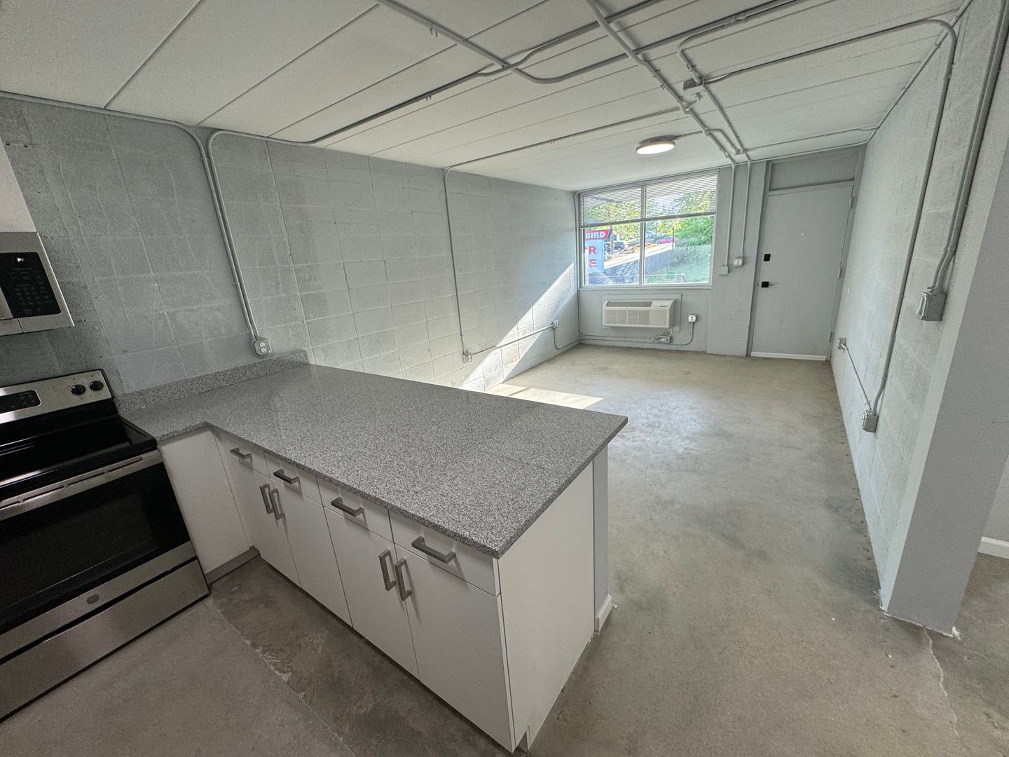 Unit boasts polished concrete floors, granite countertops, brand-new stainless-steel fridge, stove, microwave & dishwasher, ventless washer/dryer stack units & on-site parking!